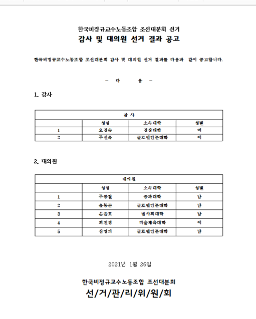 2020 한국비정규교수노동조합 조선대분회 감사 및 대의원 선거 페이지 정보 작성자 조선대분회 작성일21-01-28 23:09 조회745회 댓글0건 이전글 다음글 목록 본문 감사합니다 댓글목록 등록된 댓글이 없습니다. 이전글 다음글 목록