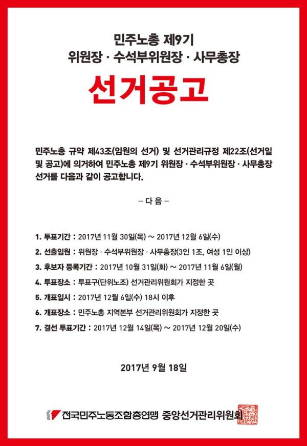 민주노총 9기 위원장, 수석부위원장, 사무총장 선거공고 페이지 정보 작성자 조선대분회 작성일17-09-21 01:57 조회282회 댓글0건 이전글 다음글 목록 본문 민주노총 9기 위원장, 수석부위원장, 사무총장 선거공고 댓글목록 등록된 댓글이 없습니다. 이전글 다음글 목록