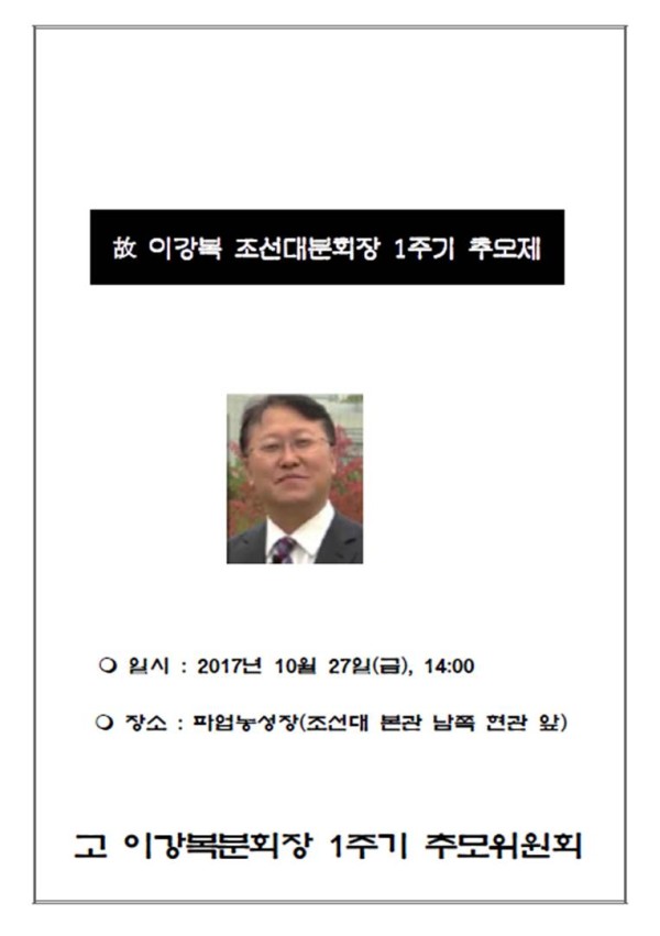 고 이강복 분회장 1주기 추모제 안내 페이지 정보 작성자 조선대분회 작성일17-10-19 02:04 조회744회 댓글0건 이전글 다음글 목록 본문 많은 참석 부탁드립니다. 댓글목록 등록된 댓글이 없습니다. 이전글 다음글 목록