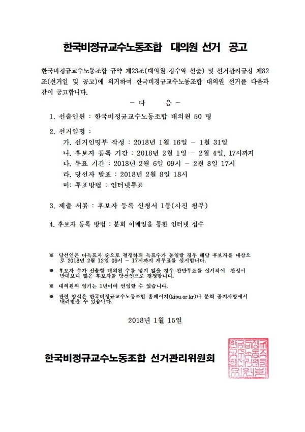 2018년 한국비정규교수노동조합 대의원 선거 공고