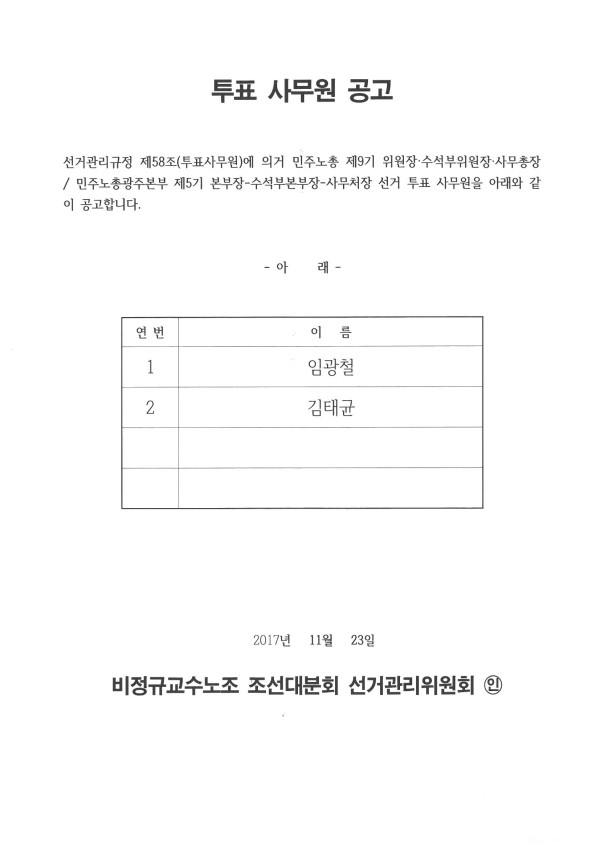 민주노총 9기 위원장 및 민주노총광주본부 5기 본부장 선거 투표 사무원 공고 페이지 정보 작성자 조선대분회 작성일17-11-23 02:10 조회701회 댓글0건 이전글 다음글 목록 본문 투표 사무원 공고 댓글목록 등록된 댓글이 없습니다. 이전글 다음글 목록
