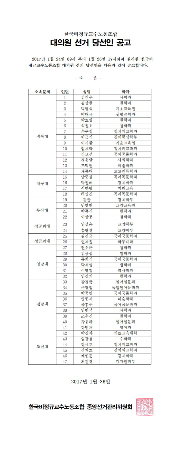 한국비정규교수노동조합 대의원선거 당선인 공고 페이지 정보 작성자 조선대분회 작성일17-01-30 21:25 조회712회 댓글0건 이전글 다음글 목록 본문 한국비정규교수노동조합 대의원선거 당선인 공고 댓글목록 등록된 댓글이 없습니다. 이전글 다음글 목록