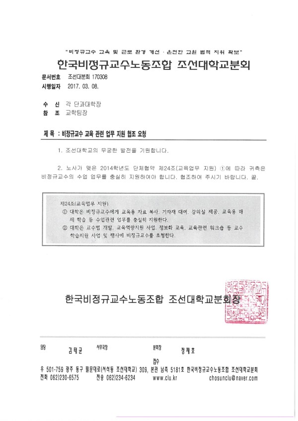 대학측에 비정규교수 교육 관련 업무을 적극 지원하여