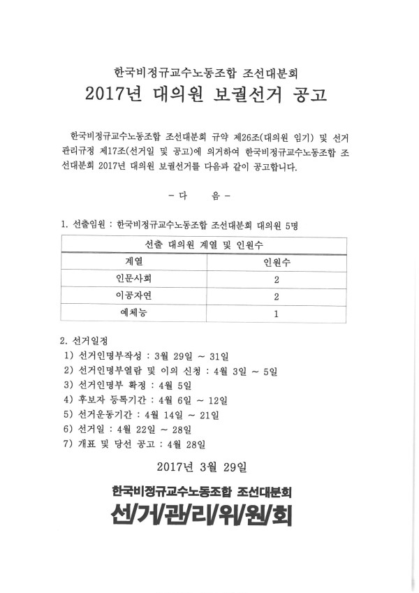 한국비정규교수노동조합 조선대분회 규약 제26조(대의원 임기) 및 선거관리규정 제17조(선거일 및 공고)에 의거하여 한국비정규교수노동조합 조선대분회 2017년 대의원 보궐선거를 다음과 같이 공고합니다.