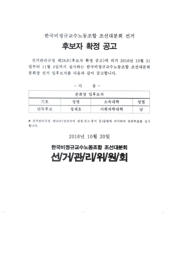 2016년 한국비정규교수노동조합 조선대분회 분회장 선거 후보자 확정공고 페이지 정보 작성자 조선대분회 작성일16-10-20 12:45 조회297회 댓글0건 이전글 다음글 목록 본문 2016년 분회장 선거 후보자를 확정공고합니다. 댓글목록 등록된 댓글이 없습니다. 이전글 다음글 목록