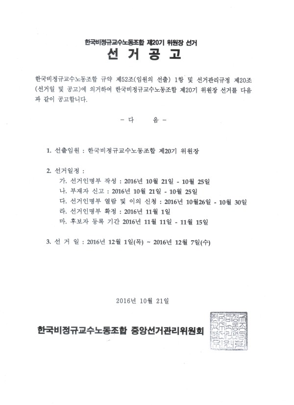 한국비정규교수노동조합 규약 제52조에 의거 한국비정규교수노동조합 제20기 위원장 선거를 공고합니다.