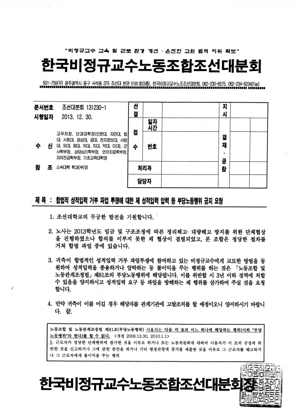 한국비정규교수노동조합 조선대분회장 드림