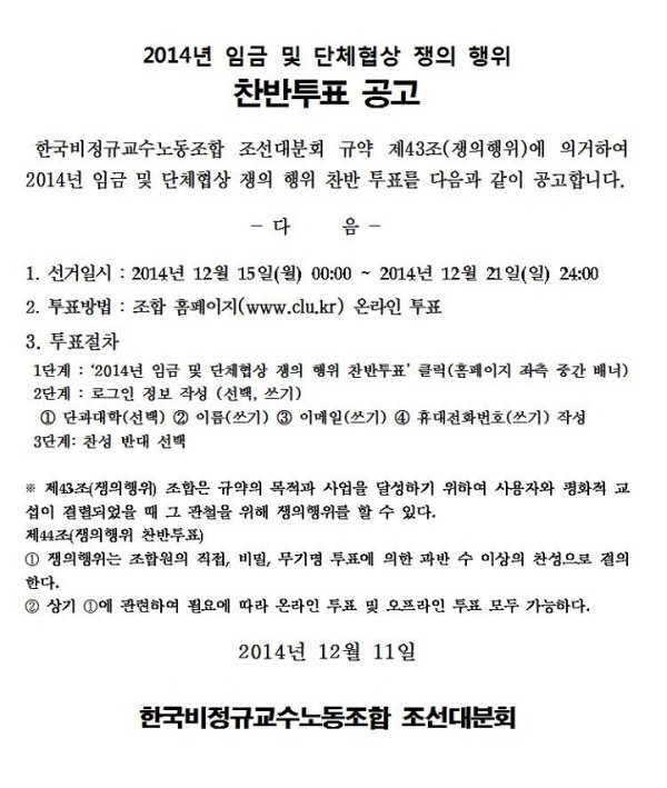 2014년 임금 및 단체협상 쟁의행위 찬반투표 공고 페이지 정보 작성자 조선대분회 작성일14-12-11 00:09 조회416회 댓글0건 이전글 다음글 목록 본문 2014년 임금 및 단체협상 쟁의행위 찬반투표 공고 댓글목록 등록된 댓글이 없습니다. 이전글 다음글 목록