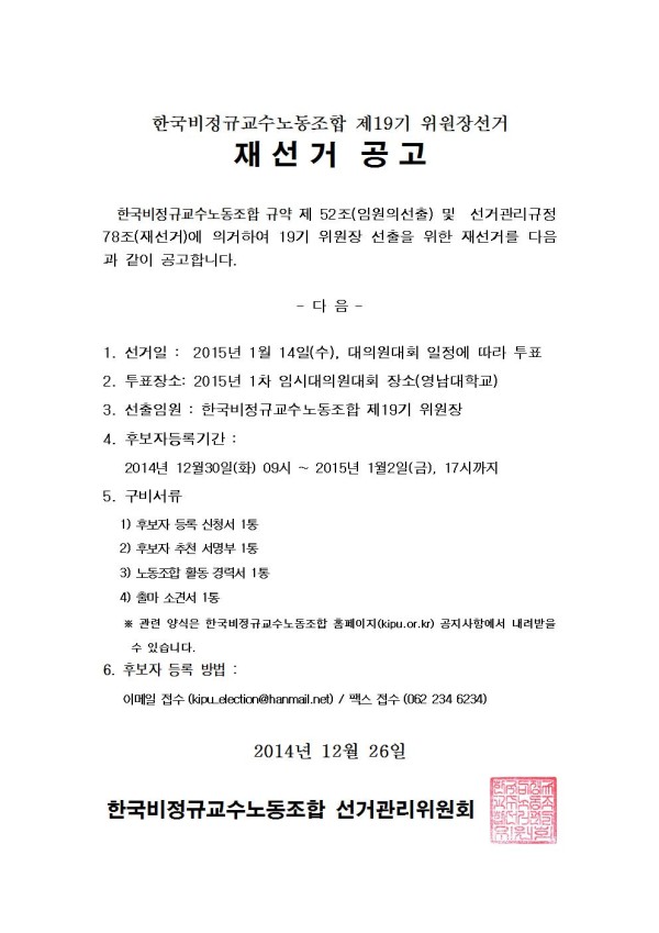 한국비정규교수노동조합 제19기 위원장 재선거 공고 페이지 정보 작성자 조선대분회 작성일14-12-26 00:47 조회389회 댓글0건 이전글 다음글 목록 본문 한국비정규교수노동조합 제19기 위원장 재선거 공고 댓글목록 등록된 댓글이 없습니다. 이전글 다음글 목록