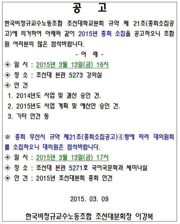 한국비정규교수노동조합 조선대분회 2015년 총회 소집 공고 페이지 정보 작성자 조선대분회 작성일15-03-09 00:54 조회369회 댓글0건 이전글 다음글 목록 본문 한국비정규교수노동조합 조선대분회 2015년 총회 소집 공고 댓글목록 등록된 댓글이 없습니다. 이전글 다음글 목록