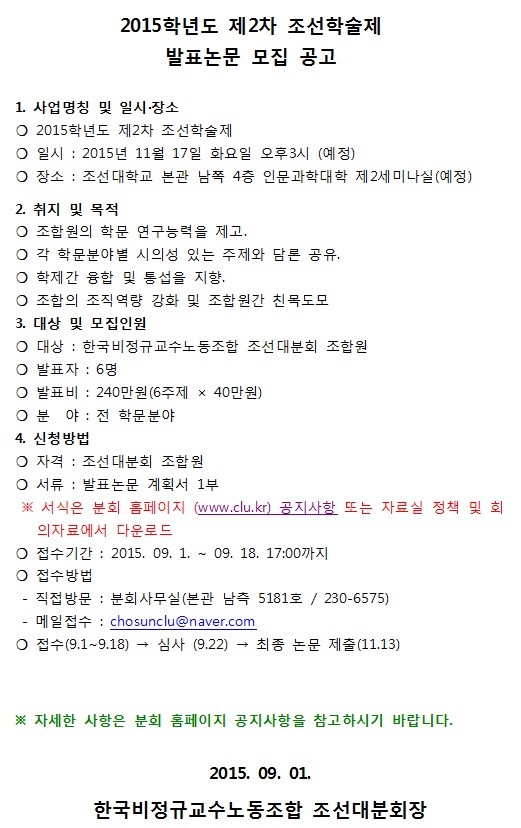 2015학년도 제2차 조선학술제 발표논문 모집 공고