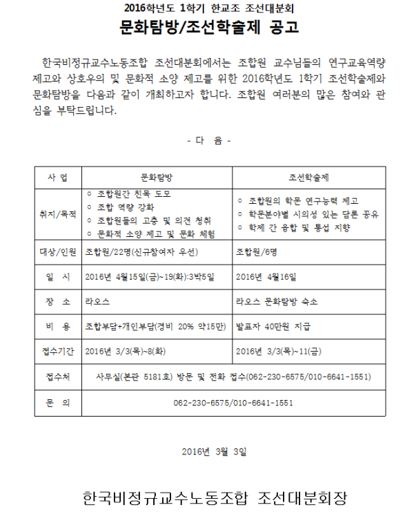 2016학년도 1학기 한교조 조선대분회 문화탐방/조선학술제 공고 페이지 정보 작성자 조선대분회 작성일16-03-03 10:39 조회406회 댓글0건 이전글 다음글 목록 본문 .. 댓글목록 등록된 댓글이 없습니다. 이전글 다음글 목록
