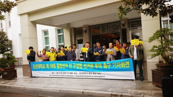 조선대학교 제 16대 총장선거 전구성원 선거권 부여 촉구 기자회견 기자회견사진 페이지 정보 작성자 조선대분회 작성일16-04-21 10:44 조회384회 댓글0건 이전글 다음글 목록 본문 .. 댓글목록 등록된 댓글이 없습니다. 이전글 다음글 목록