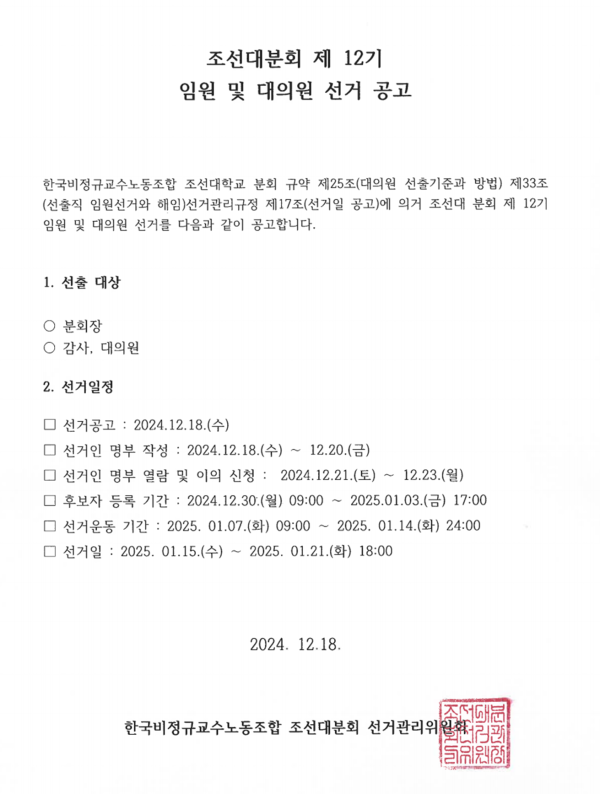 조선대분회 제 12기 임원 및 대의원 선거 공고