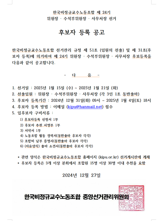 한국비정규교수노동조합 24기 위원장,수석부위원장,사무처장 선거