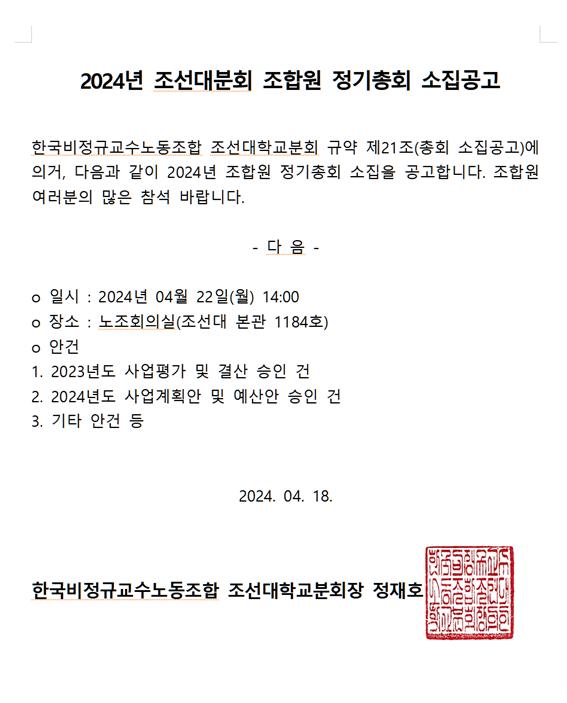 한국비정규교수노동조합 조선대학교분회 2024년 조합원 정기총회 소집 공고