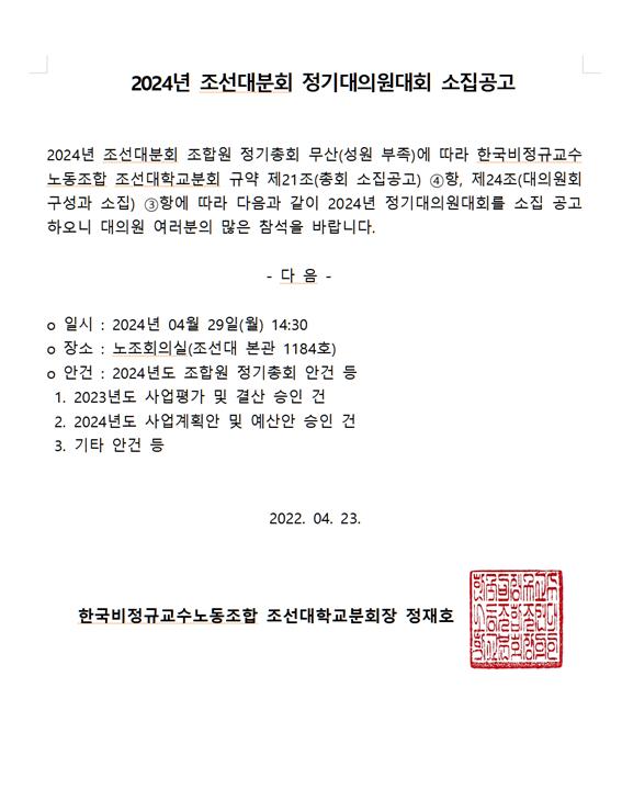 2024년 조선대분회 정기대의원대회 소집 공고 페이지 정보 작성자 조선대분회 작성일24-04-23 08:50 조회792회 댓글0건 이전글 다음글 목록 본문 2024년 조선대분회 정기대의원대회 소집 공고 댓글목록 등록된 댓글이 없습니다. 이전글 다음글 목록