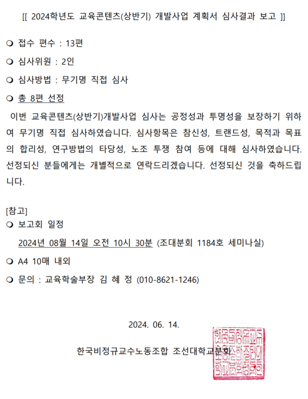 [[ 2024 교육콘텐츠(상반기) 개발사업 계획서 심사결과 보고 ]] 페이지 정보 작성자 조선대분회 작성일24-06-14 09:05 조회825회 댓글0건 이전글 다음글 목록 본문 선정되신 것을 축하드립니다!! 댓글목록 등록된 댓글이 없습니다. 이전글 다음글 목록