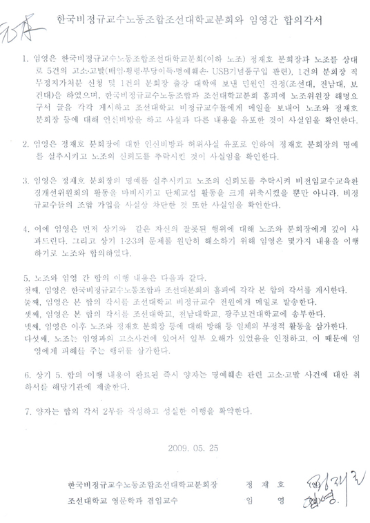 한국비정규교수노동조합조선대학교분회와 임영간 합의각서