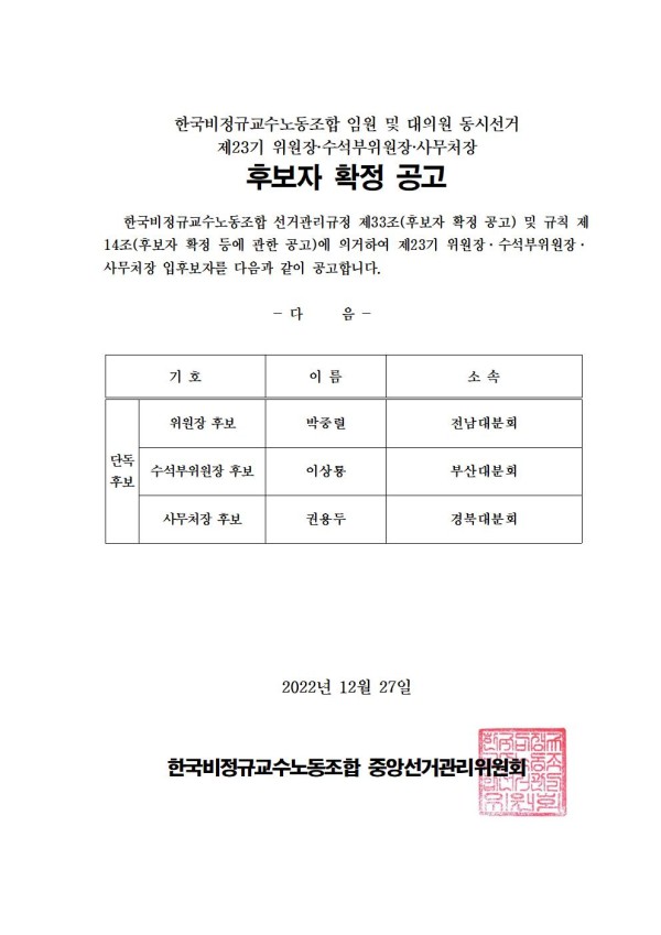 한국비정규교수노동조합 23기 임원 선거 후보자 확정 공고 페이지 정보 작성자 조선대분회 작성일23-01-02 21:38 조회783회 댓글0건 이전글 다음글 목록 본문 한국비정규교수노동조합 23기 임원 선거 후보자 확정 공고 댓글목록 등록된 댓글이 없습니다. 이전글 다음글 목록