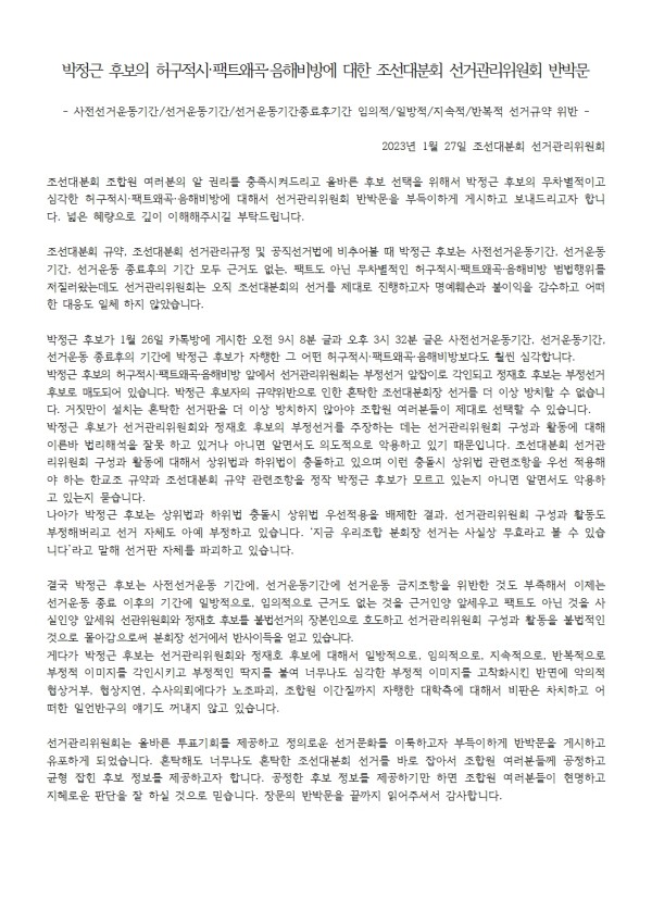 조선대분회 규약, 조선대분회 선거관리규정 및 공직선거법에 비추어볼 때 박정근 후보는 사전선거운동기간, 선거운동기간, 선거운동 종료후의 기간 모두 근거도 없는, 팩트도 아닌 무차별적인 허구적시·팩트왜곡·음해비방 범법행위를 저질러왔는데도 선거관리위원회는 오직 조선대분회의 선거를 제대로 진행하고자 명예훼손과 불이익을 감수하고 어떠한 대응도 일체 하지 않았습니다.