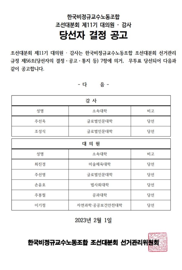 조선대분회 제11기 대의원 · 감사 당선자 결정 공고