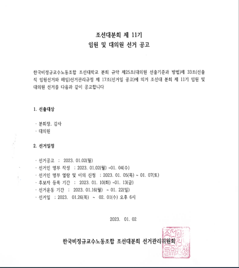 조선대분회 제 11기 임원 및 대의원 선거 공고