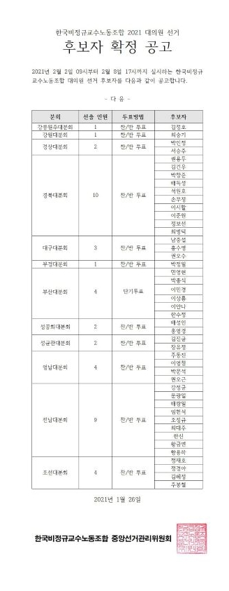 한국비정규교수노조 대의원선거 후보자 공고 페이지 정보 작성자 조선대분회 작성일21-01-28 23:10 조회763회 댓글0건 이전글 다음글 목록 본문 감사합니다 댓글목록 등록된 댓글이 없습니다. 이전글 다음글 목록