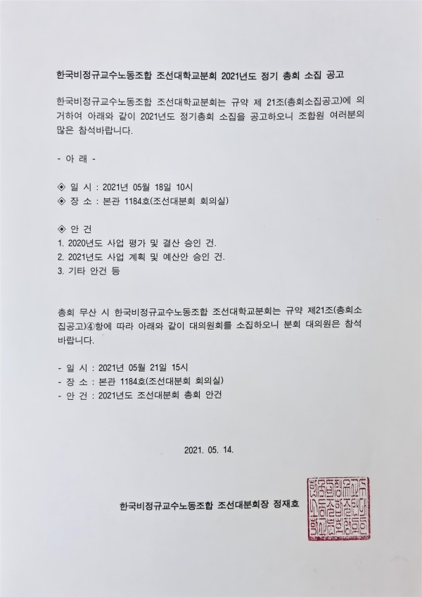 한국비정규교수노동조합 조선대학교분회 2021년도 정기 총회 소집 공고 페이지 정보 작성자 조선대분회 작성일21-05-14 23:12 조회770회 댓글0건 이전글 다음글 목록 본문 2021 정기총회 및 대의원대회 소집공고 댓글목록 등록된 댓글이 없습니다. 이전글 다음글 목록