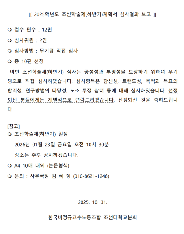 [[ 2025 조선학술제(하반기) 사업 계획서 심사결과 보고 ]] 페이지 정보 작성자 조선대분회 작성일25-10-31 10:04 조회473회 댓글0건 이전글 다음글 목록 본문 선정되신것을 축하드립니다!! 댓글목록 등록된 댓글이 없습니다. 이전글 다음글 목록