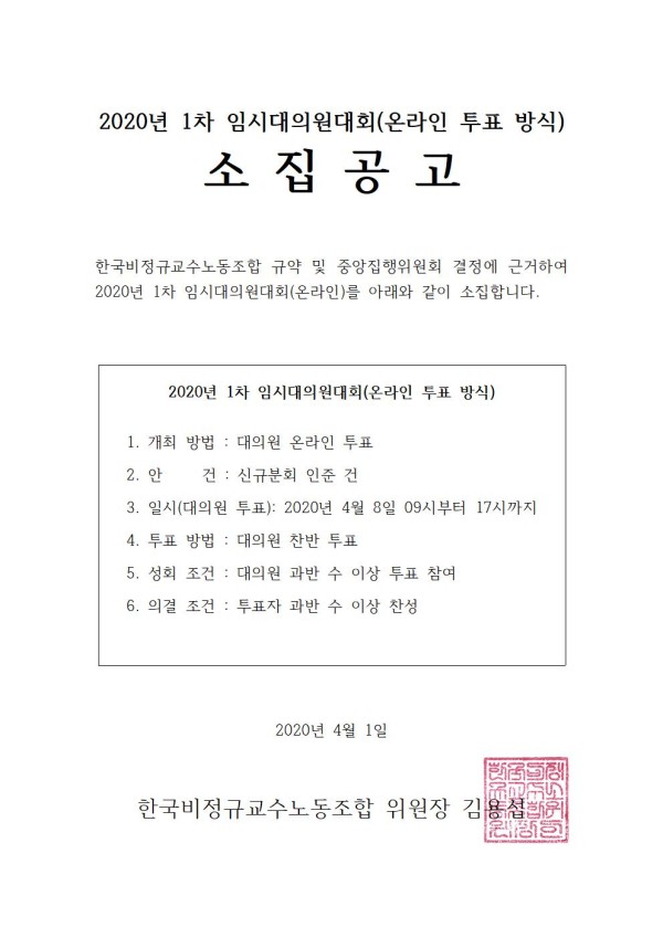 [한국비정규교수노동조합 2020년 1차 임시대의원대회(온라인 투표 방식) 소집 안내]
