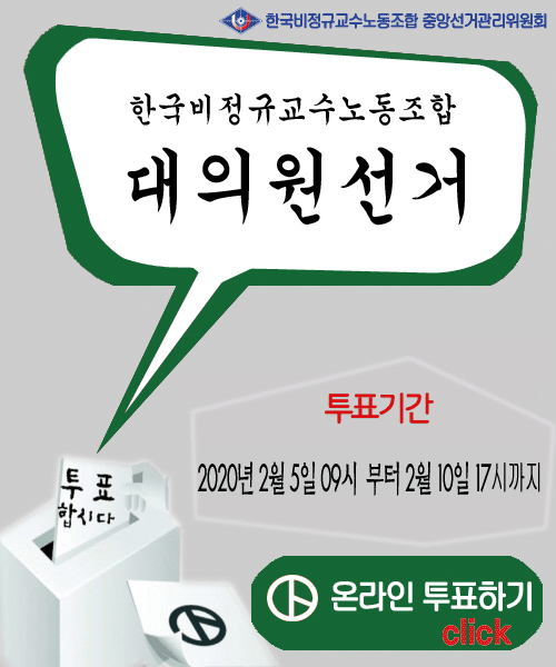 한국비정규교수노동조합 2020년 본조 대의원선거 페이지 정보 작성자 조선대분회 작성일20-02-05 17:13 조회410회 댓글0건 이전글 다음글 목록 본문 한국비정규교수노동조합 2020년 본조 대의원선거 댓글목록 등록된 댓글이 없습니다. 이전글 다음글 목록