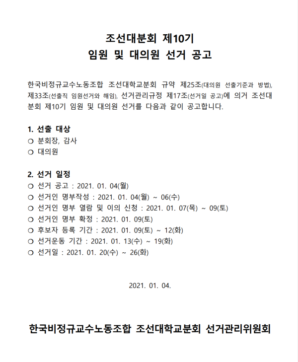 조선대분회 제10기 임원 및 대의원 선거 공고