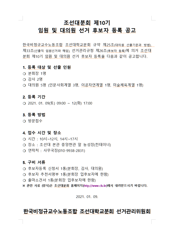 조선대분회 제10기 임원 및 대의원 후보자 등록 공고