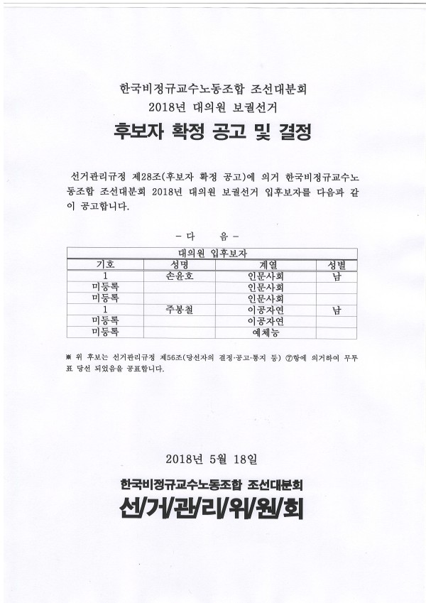 2018년 대의원 보궐선거 후보자 확정공고 및 결정 페이지 정보 작성자 조선대분회 작성일18-05-18 10:43 조회405회 댓글0건 이전글 다음글 목록 본문 2018년 대의원 보궐선거 후보자 확정공고 및 결정 댓글목록 등록된 댓글이 없습니다. 이전글 다음글 목록