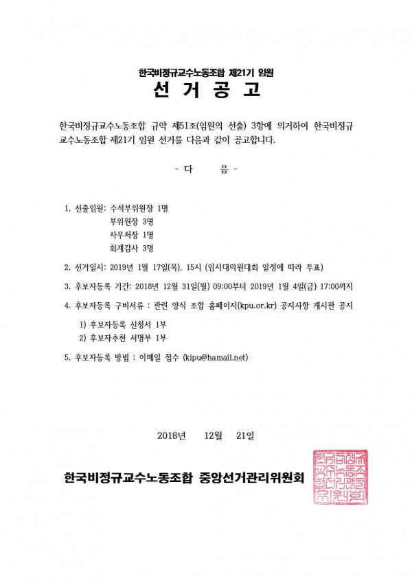 한국비정규교수노동조합 제21기 간선임원 선거공고