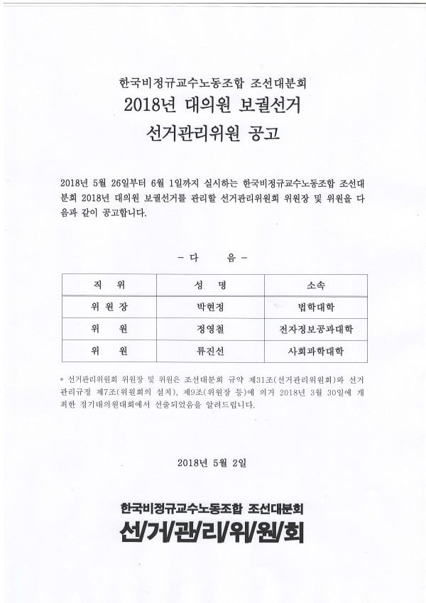 2018년 대의원 보궐선거 선거관리위원 공고 페이지 정보 작성자 조선대분회 작성일18-05-02 10:37 조회387회 댓글0건 이전글 다음글 목록 본문 2018년 대의원 보궐선거 선거관리위원 공고 댓글목록 등록된 댓글이 없습니다. 이전글 다음글 목록