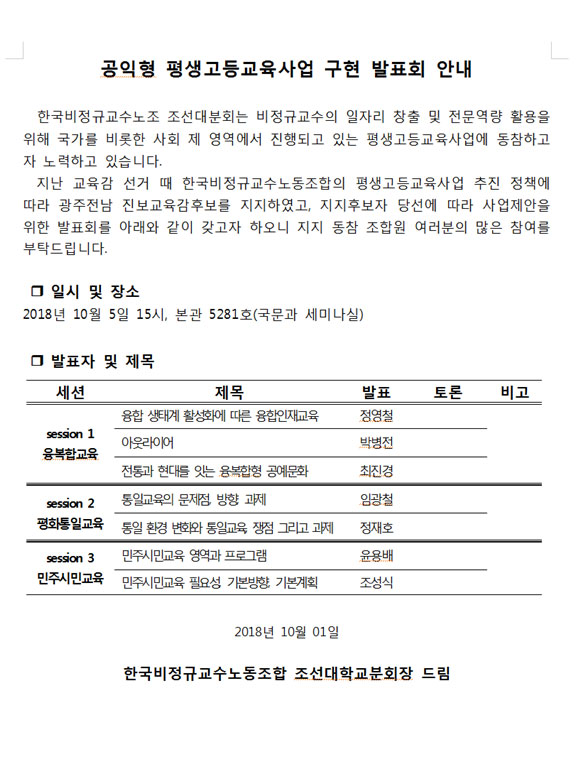 공익형 평생고등교육사업 구현 발표회 안내 페이지 정보 작성자 조선대분회 작성일18-10-02 10:52 조회402회 댓글0건 이전글 다음글 목록 본문 공익형 평생고등교육사업 구현 발표회 안내 댓글목록 등록된 댓글이 없습니다. 이전글 다음글 목록