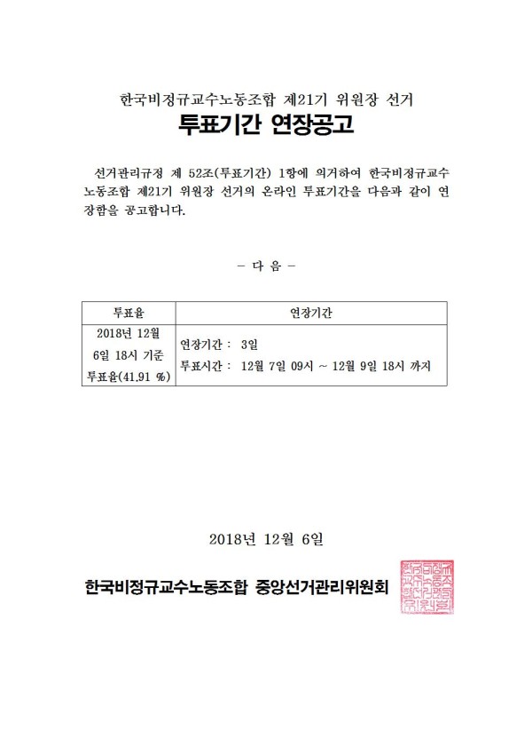한국비정규교수노동조합 제21기 위원장 선거 투표기간 연장 공고 페이지 정보 작성자 조선대분회 작성일18-12-07 13:29 조회375회 댓글0건 이전글 다음글 목록 본문 한국비정규교수노동조합 제21기 위원장 선거 투표기간 연장 공고 댓글목록 등록된 댓글이 없습니다. 이전글 다음글 목록