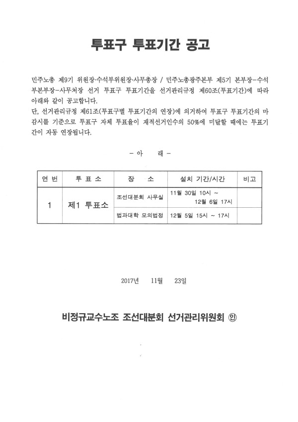 민주노총 9기 위원장 및 민주노총광주본부 5기 본부장 선거 투표구 및 투표기간 공고 페이지 정보 작성자 조선대분회 작성일17-11-23 02:07 조회362회 댓글0건 이전글 다음글 목록 본문 투표구 및 투표기간 공고 댓글목록 등록된 댓글이 없습니다. 이전글 다음글 목록