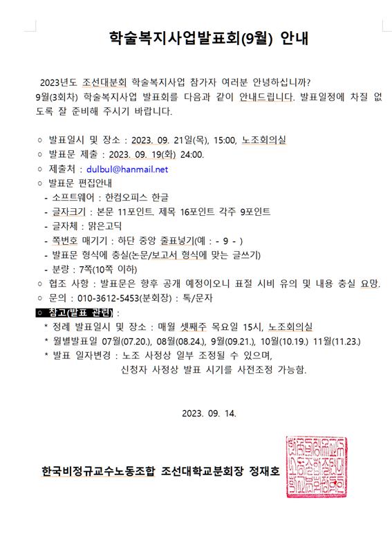 학술복지사업발표회(9월) 안내 페이지 정보 작성자 조선대분회 작성일23-09-14 08:26 조회429회 댓글0건 이전글 다음글 목록 본문 학술복지사업발표회(9월) 안내 댓글목록 등록된 댓글이 없습니다. 이전글 다음글 목록