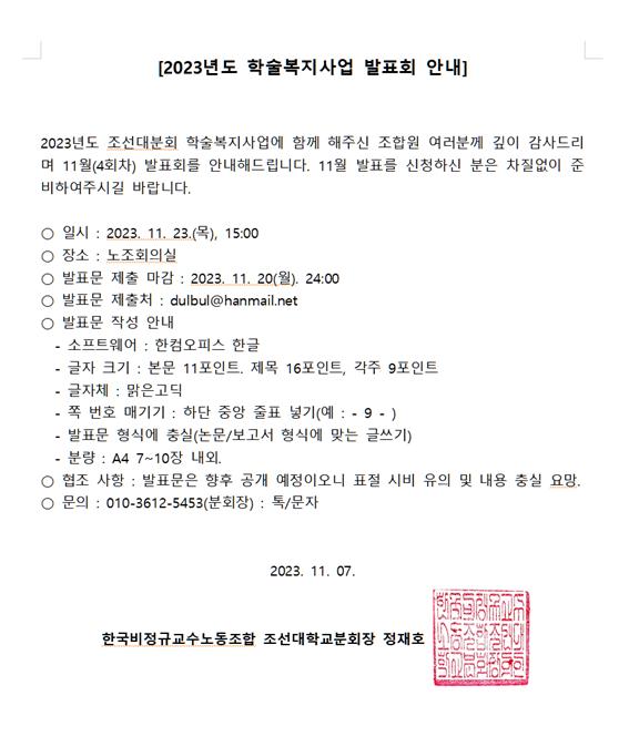 2023년도 학술복지사업 발표회(11월) 안내 페이지 정보 작성자 조선대분회 작성일23-11-07 08:32 조회440회 댓글0건 이전글 다음글 목록 본문 2023년도 학술복지사업 발표회(11월) 안내(홈피게시용) 댓글목록 등록된 댓글이 없습니다. 이전글 다음글 목록
