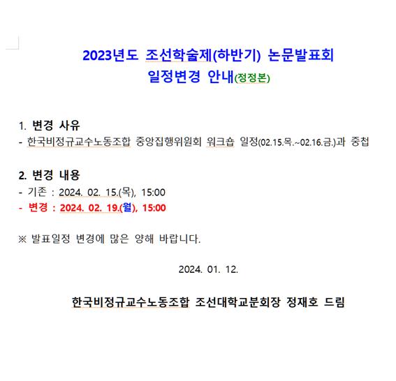 조선학술제(하반기) 논문발표회 일정변경 안내 페이지 정보 작성자 조선대분회 작성일24-01-12 08:44 조회437회 댓글0건 이전글 다음글 목록 본문 조선학술제(하반기) 논문발표회 일정변경 안내 댓글목록 등록된 댓글이 없습니다. 이전글 다음글 목록