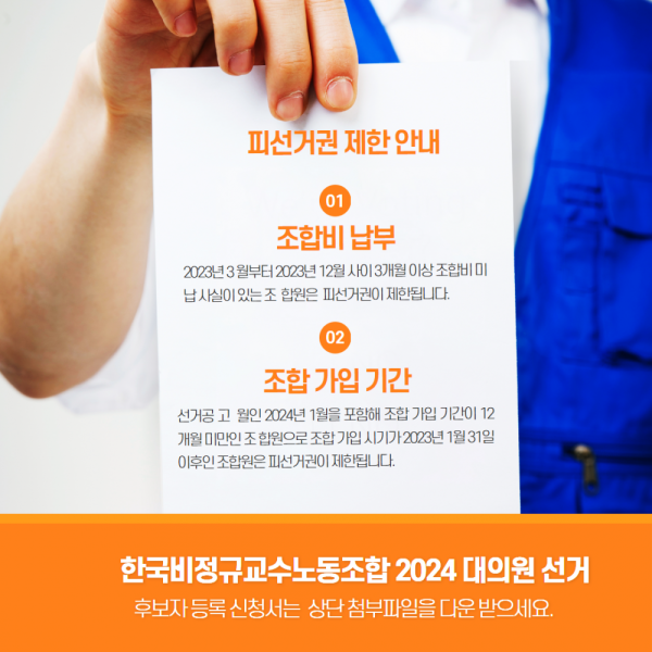 한국비정규교수노동조합 선거관리규정 제96조(후보자등록)에 의거하여 2024년 대의원 후보등록을 다음과 같이 공고합니다.