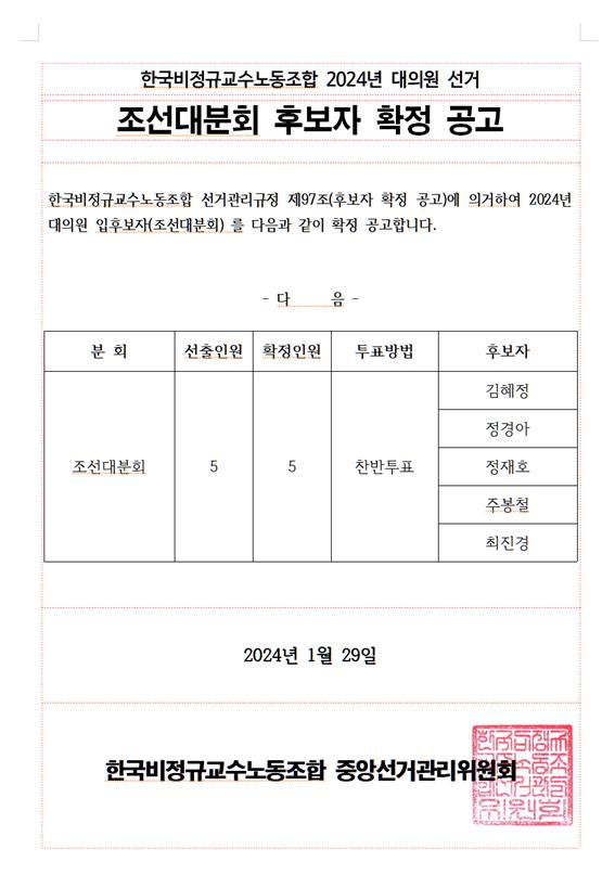 한국비정규교수노동조합 2024년 대의원 선거 후보자(조선대분회) 확정 공고