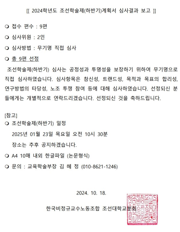 [[ 2024 조선학술제(하반기) 사업 계획서 심사결과 보고 ]] 페이지 정보 작성자 조선대분회 작성일24-10-18 09:18 조회407회 댓글0건 이전글 다음글 목록 본문 축하드립니다!! 댓글목록 등록된 댓글이 없습니다. 이전글 다음글 목록