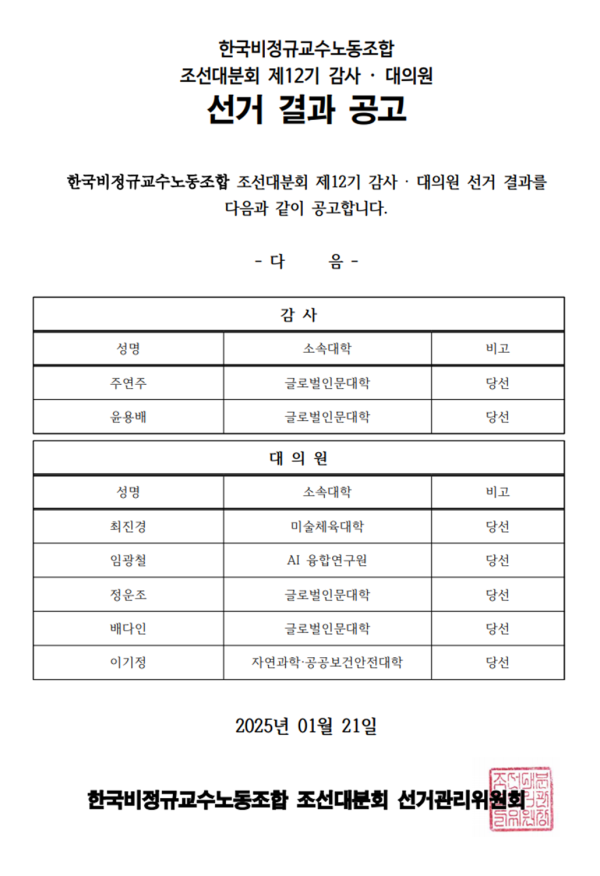 조선대분회 제12기 감사, 대의원 선거 결과 공고입니다. 페이지 정보 작성자 조선대분회 작성일25-01-21 09:41 조회408회 댓글0건 이전글 다음글 목록 본문 조선대분회 제12기 감사, 대의원 선거 결과 공고입니다. 댓글목록 등록된 댓글이 없습니다. 이전글 다음글 목록