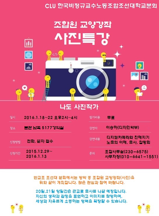 조선대분회 조합원 교양강좌 사진특강 페이지 정보 작성자 조선대분회 작성일15-12-29 10:29 조회283회 댓글0건 이전글 다음글 목록 본문 .. 댓글목록 등록된 댓글이 없습니다. 이전글 다음글 목록