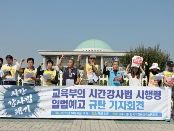 첫째, 교육부는 이해당사자들의 의견을 수차례 수렴했다고 주장하고 있다. 특히 시간강사노조의 의견을 수렴했다고 한다. 필시 우리를 지칭하는 말일 것이다. 그런데 우리는 2015녀 상반기에 시간강사법에 대하여 시행하지 말라는 요구사항만 전달하고 왔다. 강사법TFT에도 참가단위로 참석한 바 없고, 기습적으로 강사법TFT가 한국장학재단에서 열렸을 때 그 곳을 기습 방문하여 강사법TFT의 해체를 요구하는 문서를 제출하고 왔다. 대교협에도, 전국교무처장단협의회에도, 전국국공립대총장협의회 총회장에서도 마찬가지 활동을 했다. 우리의 입장은 시간강사법 시행 저지에서 한 번도 벗어난 적 없다. 그런데 우리 의견이 시간강사법 시행령에 어떻게 반영될 수 있단 말인가? 논리적으로 성립할 수 없는 논리로 교육부는 언론 플레이를 하고 있다. 언론은 이와 같은 팩트 아래 취재를 해 주시기 바란다. 2013년에도 비정규교수 대표 단체인 한국비정규교수노동조합(우리)와 단 한 번도 만난 적이 없다. 우리는 강사법과 관련하여 장관 면담을 수차례 요청하였으나 지금까지 면담이 성사되지 않고 있다. 그런데 그 때도 교육부는 강사법 시행령과 관련하여 비정규교수의 의견을 수차례나 듣고 의견을 수렴했다는 보도 자료를 냈다. 어찌된 게 교육부만 들어가면 그 관료는 거짓말까지 그대로 베껴서 보도자료를 내는가? 참으로 기이한 일이 아닐 수 없다. 하긴 교육부는 2011년에 강사를 ‘교원 외 교원’이라는 교원으로 한다는 해괴한 어법을 구사한 적도 있다. 교원 외 교원은 교원인가 아닌가? 이 질문에 교육부가 답을 할 수 없자 슬그머니 그 용어를 삭제하고 신설한 조항이 고등교육법 14조2항의 밑에 둔 고등교육법 14조의2이다. 즉 교원 같지 않은 교원, 무늬만 교원, 짝퉁 교원이 강사인 것이다.