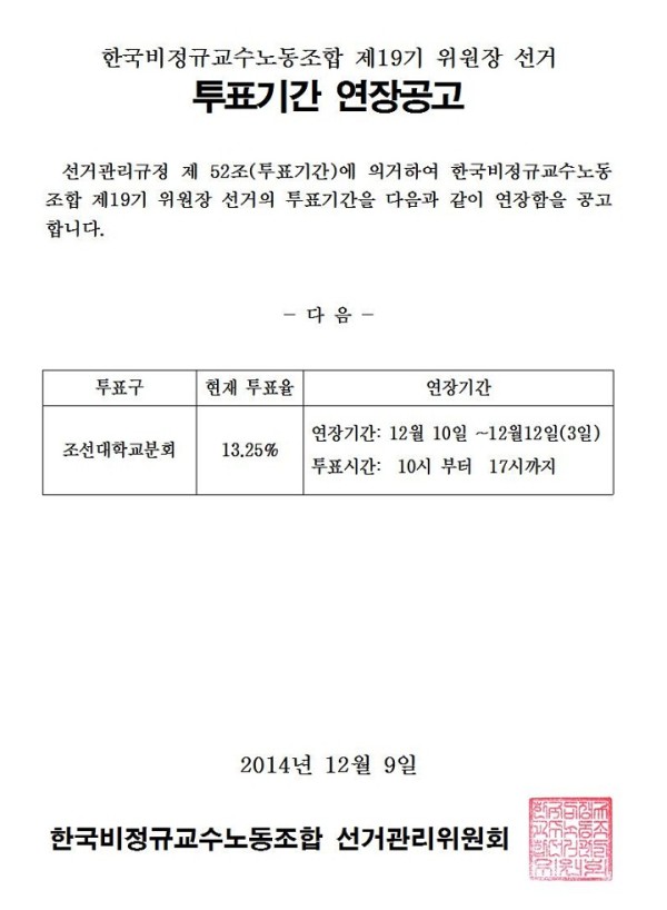 한국비정규교수노동조합 제 19기 위원장 직선제 선거 투표기간 연장 공고